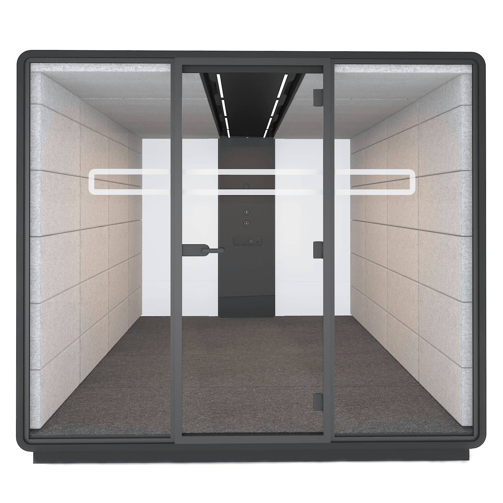 Er is veel ruimte in vergaderbox Hush Meet L4. Met maar liefst 4 tot 8 collega’s vergader jij comfortabel. Hoe zit het dan met de ventilatie? De box bevat 16 ventilatoren! Samen verversen zij per uur 100m3 lucht. Zet de ventilator harder of zachter met knoppen in de middenconsole. Dit is ook de plek waar jij de sterkte van de verlichting bepaald. Pas de Hush Meet L4 aan op jouw voorkeuren. Heb jij de meetings met jouw collega’s al ingepland? Hush Meet L4 is de perfecte setting!