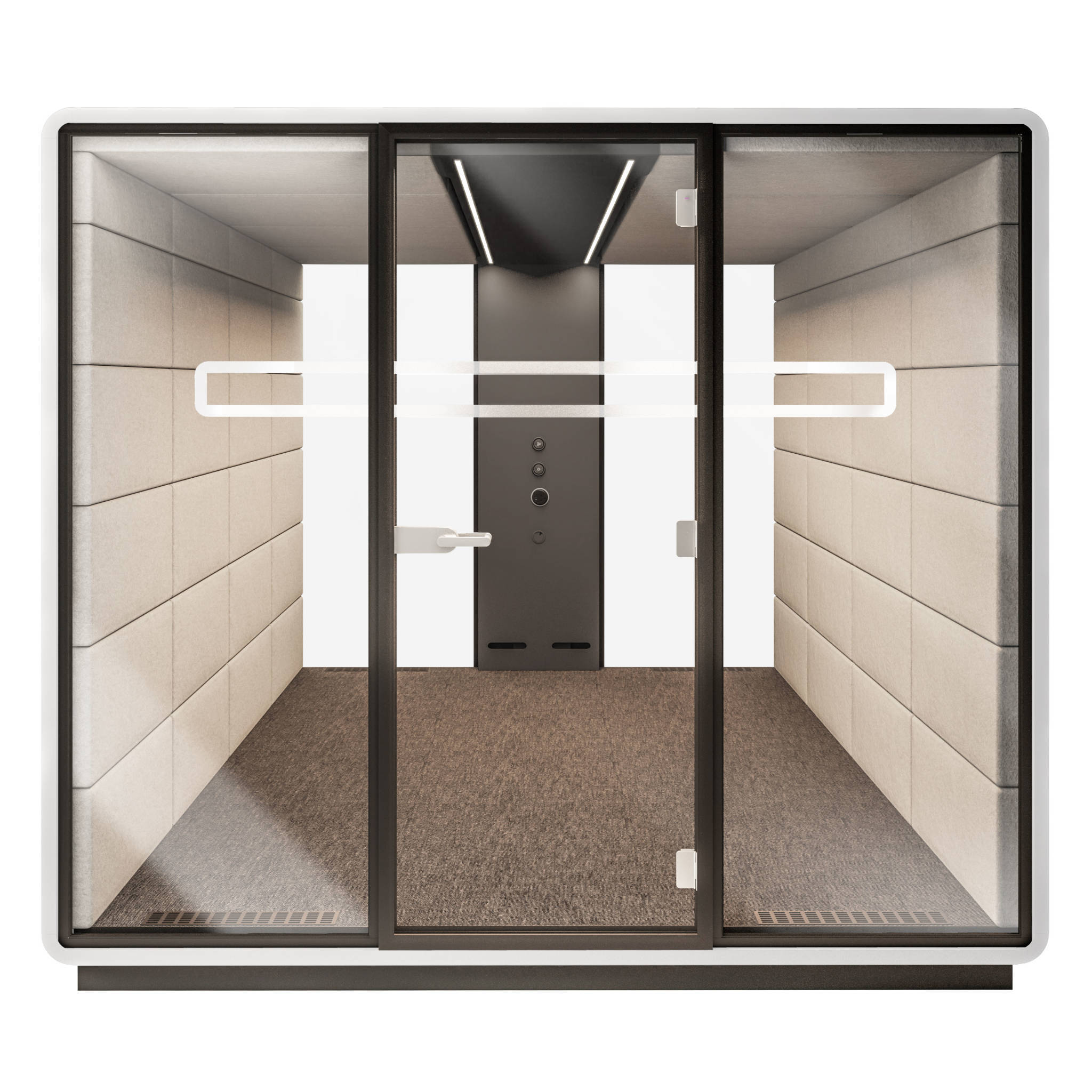 Er is veel ruimte in vergaderbox Hush Meet L4. Met maar liefst 4 tot 8 collega’s vergader jij comfortabel. Hoe zit het dan met de ventilatie? De box bevat 16 ventilatoren! Samen verversen zij per uur 100m3 lucht. Zet de ventilator harder of zachter met knoppen in de middenconsole. Dit is ook de plek waar jij de sterkte van de verlichting bepaald. Pas de Hush Meet L4 aan op jouw voorkeuren. Heb jij de meetings met jouw collega’s al ingepland? Hush Meet L4 is de perfecte setting!